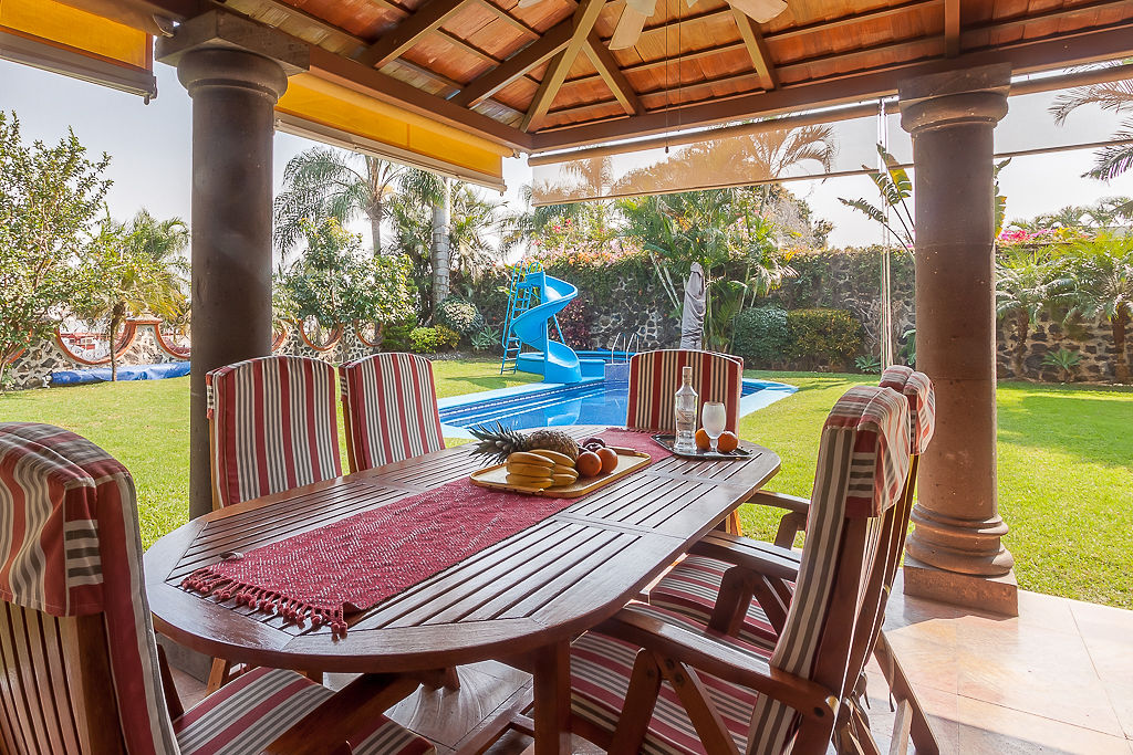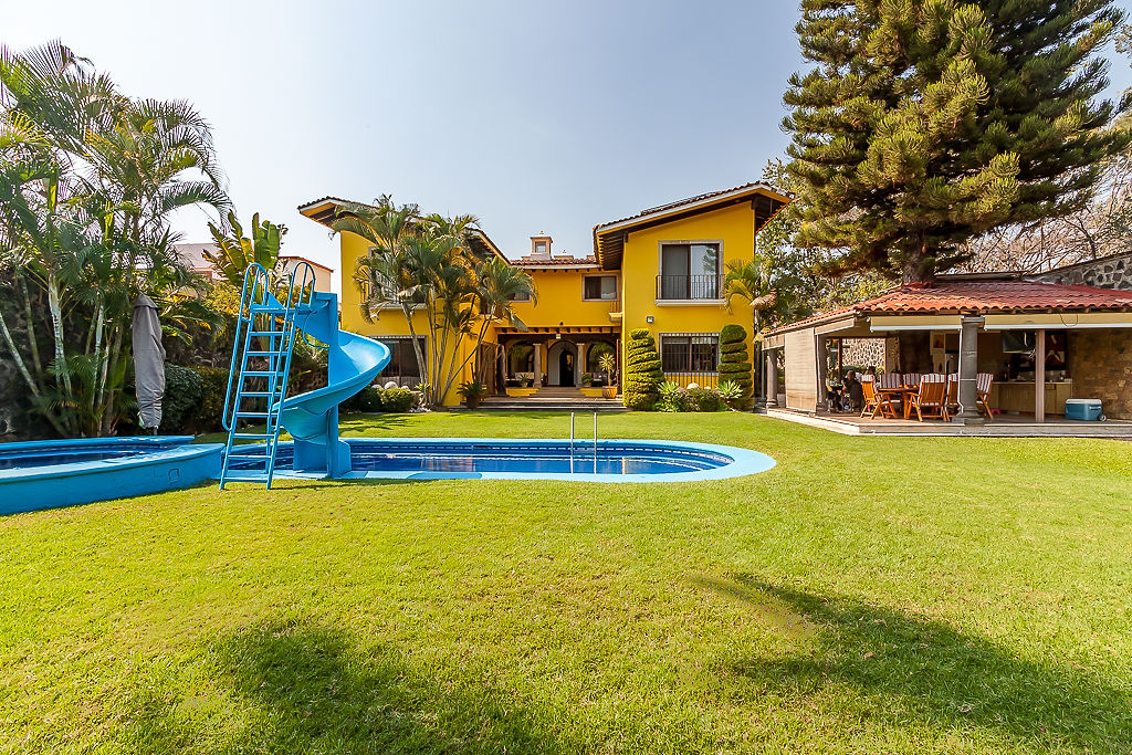 El exterior ofrece una agradable terraza con columnas de cantera, rodeada de vegetación madura y vista directa al jardín. La propiedad cuenta con una alberca privada y áreas verdes amplias que brindan un entorno tranquilo y funcional, ideal para convivencias y descanso en un ambiente residencial exclusivo.